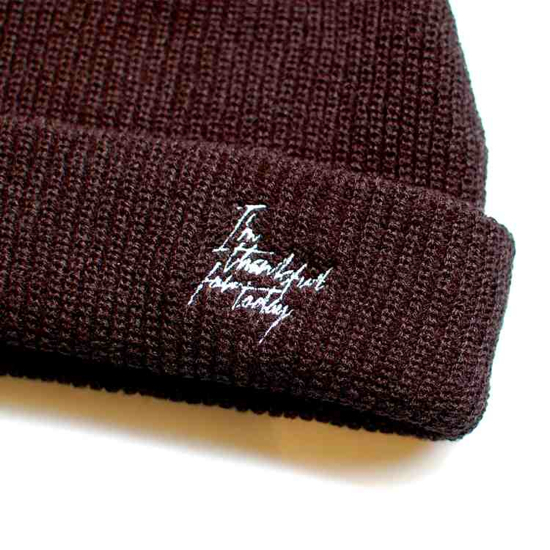 I'M THANKFUL FOR TODAYが刺繍されたシンプルなビーニー。